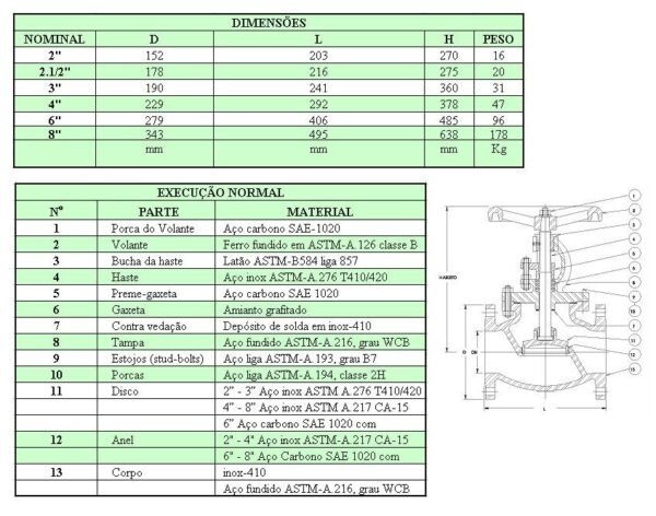 Válvulas globo, de aço carbono fundido, componentes internos de aço inoxidável.